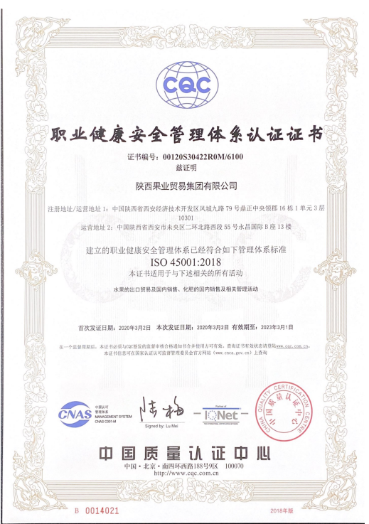陕果贸易公司取得职业健康安全和环境管理体系两项认证