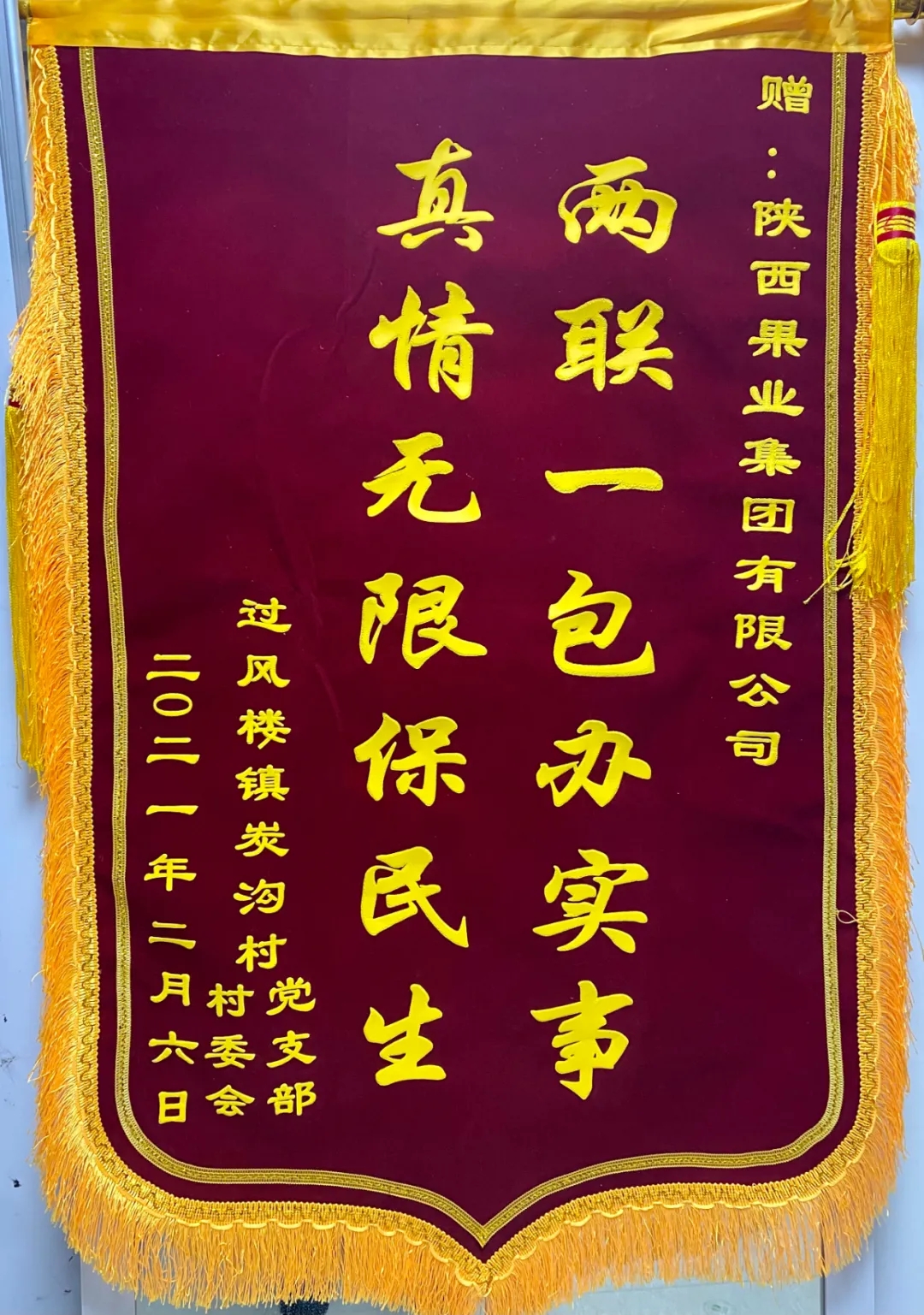 近日,商南县委县政府向陕果集团发来感谢信和锦旗。信中感谢集团对商南县“两联一包”扶贫工作的帮助和关爱,对集团在商南县开展的脱贫攻坚工作给与了肯定和赞扬。